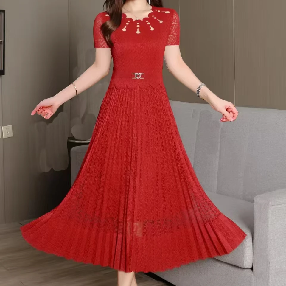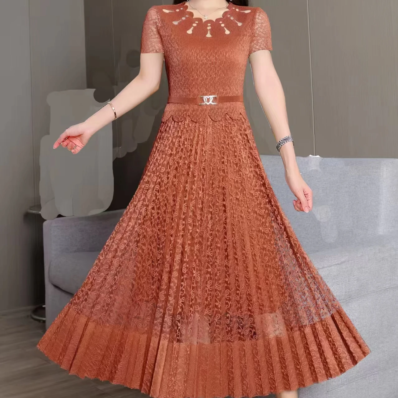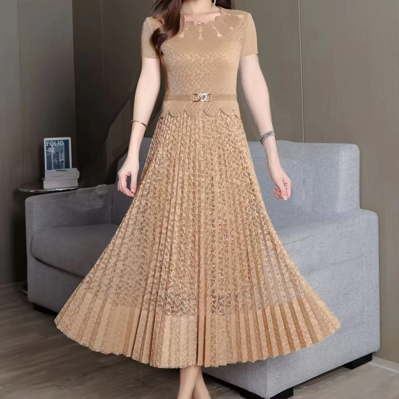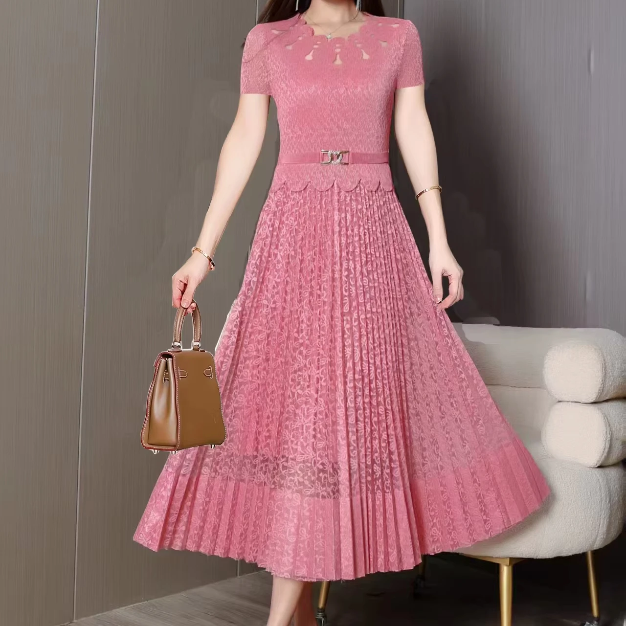 2025 Autumn Casual Dress Solid Color Round Neck Pleated High Waist Short Sleeve Lace Belt Spliced Dress